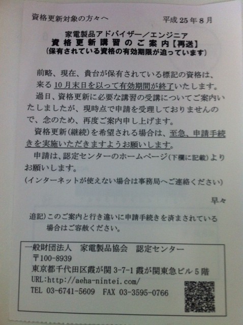 サラリーマン時代に取得した(させられた?)「家電総合アドバイザー」の資格更新のはがきが届きました。